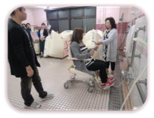 業務用洗濯機はとても大きいですよ。平日昼間は洗濯専門のパートさんとシルバー人材センターの方が担当してくれています。 職員用洗濯機もあるのでユニフォームを持ち帰らなくていいのが便利♪